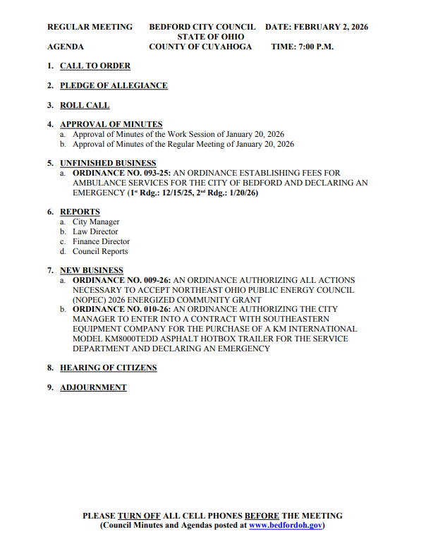 TONIGHT 02/02/2026 City Council Work Session & Meeting Agendas Posted by Erica Schmidt | Feb 2, 2026 | Council Agendas | 0 | facebook twitter Print Friendly Like Work Session at 5:00pm Erica Schmidt | The Bedford Tribune Meeting at 7:00pm Erica Schmidt | The Bedford Tribune facebook twitter Print Friendly Like
