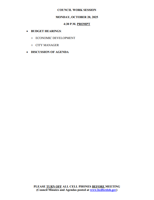 TONIGHT 10/20/2025 City Council Work Session & Meeting Agendas Posted by Erica Schmidt | Oct 20, 2025 | Council Agendas | 0 | facebook twitter Print Friendly Like Work Session at 4:30pm Erica Schmidt | The Bedford Tribune Meeting at 7:00pm Erica Schmidt | The Bedford Tribune Erica Schmidt | The Bedford Tribune facebook twitter Print Friendly Like