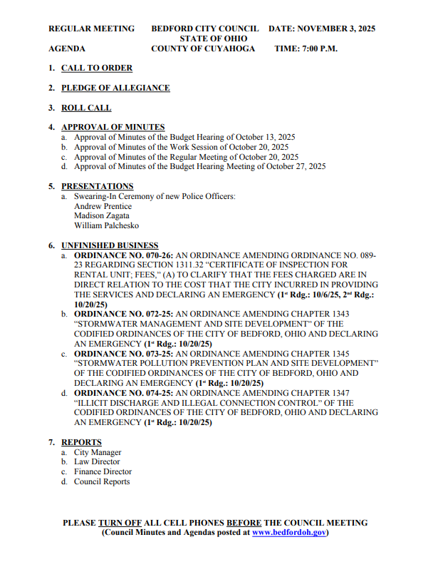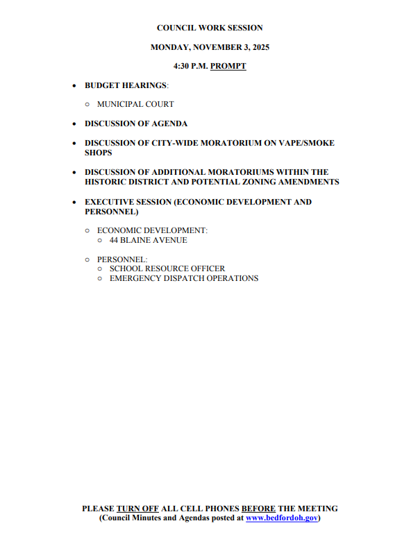 TONIGHT 11/3/2025 City Council Work Session & Meeting Agendas Posted by Erica Schmidt | Nov 3, 2025 | Council Agendas | 0 | facebook twitter Print Friendly Like Work Session at 4:30pm Erica Schmidt | The Bedford Tribune Meeting at 7:00pm Erica Schmidt | The Bedford Tribune facebook twitter Print Friendly Like