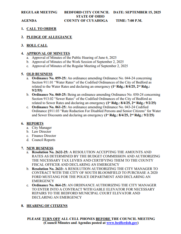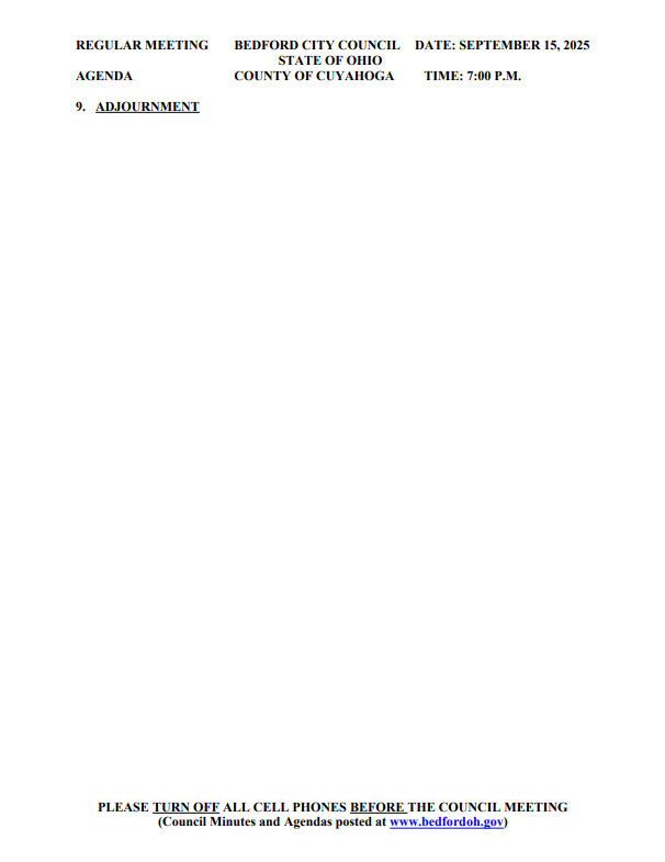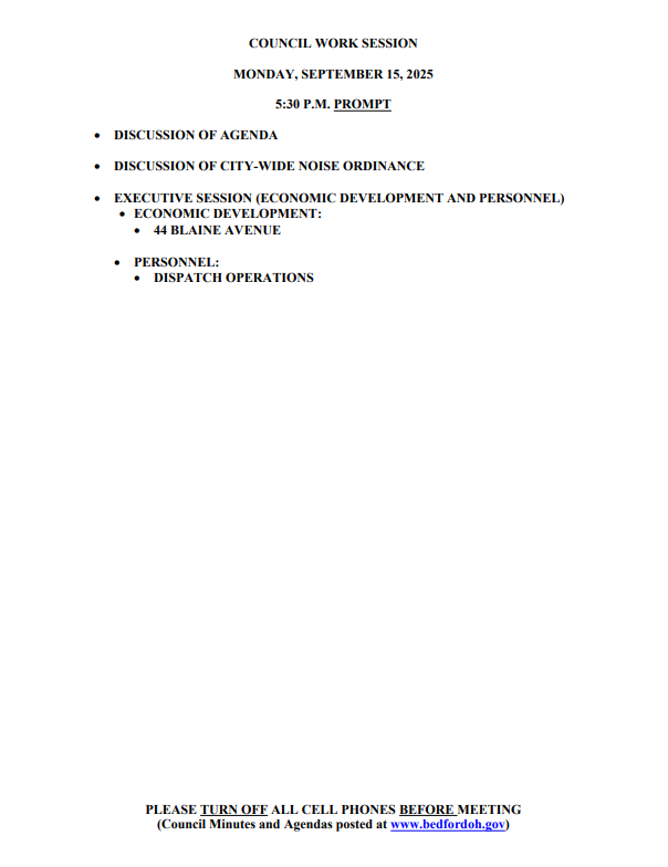 TONIGHT 9/15/2025 Council Meeting & Work Session Agendas Posted by Erica Schmidt | Sep 15, 2025 | Council Agendas | 0 | facebook twitter Print Friendly Like Work Session at 5:30pm Erica Schmidt | The Bedford Tribune Meeting at 7:00pm Erica Schmidt | The Bedford Tribune Erica Schmidt | The Bedford Tribune facebook twitter Print Friendly Like